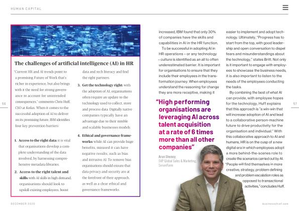 “ Current HR and AI trends point to a promising Future of Work that ’ s richer in experience , but also brings with it the need for strong governance to account for unintended consequences ,” comments Chris Huff , CSO at Kofax . When it comes to the successful adoption of AI to deliver on its promising future , IBM identifies four key prevention barriers :