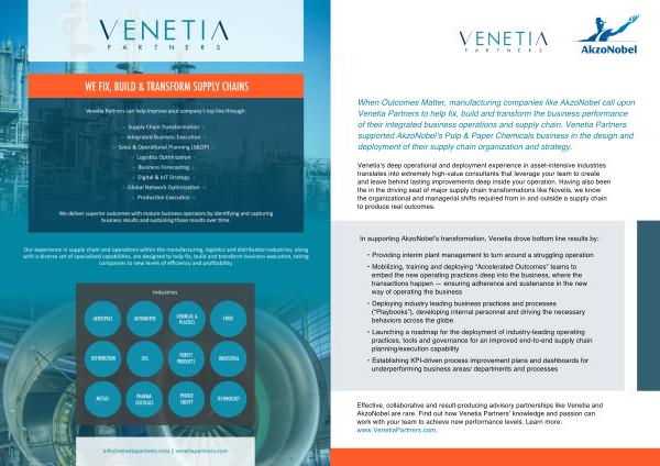 When Outcomes Matter , manufacturing companies like AkzoNobel call upon Venetia Partners to help fix , build and transform the business performance of their integrated business operations and supply chain . Venetia Partners supported AkzoNobel ’ s Pulp & Paper Chemicals business in the design and deployment of their supply chain organization and strategy .