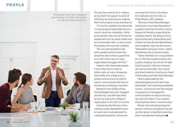 “ She ’ s responsible for the onboarding process for each new Spreadster , and improving workplace culture . In particular she has brought in programs on management communication to improve the way we work with talent . If you respect and empower talent , it wants to stay .” Words which should perhaps be borne in mind by companies who are worried about competitors poaching their most talented employees .