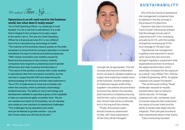 “ As a Chief Operating Officer , my challenge is multifaceted . It is not a role that is well defined . It is a role that is integral to the company but is also unique to the sector I am in . The role of a Chief Operating Officer for a financial services firm is very different from one in manufacturing , technology or health . “ The maturity of the business impacts greatly on the skills necessary to ensure that the company operates in a manner that allows it to react to internal and external pressures . “ With market uncertainty and volatility caused by Brexit and the pressure on the currency markets , companies have required a sustained pursuit of greater efficiencies and major business transformations . “ The nature of the position is diverse with a wide variation in operational roles from one sector to another , but the core lies in supporting the CEO and determining the optimal strategy for the future and then help implement it . “ As a CTO , it made sense to move into a broader role within the company which is primarily a technologyenabled business . The ability to marry technology and development skillsets to operations gives us the capability to take our operational agility to another level . We are not wedded and reliant on third parties , we can develop and create our own solutions to operational challenges . “ The challenges facing operations are varied and can be likened to guerilla warfare – you just don ’ t know where you will have to be next .”