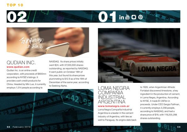 LOMA NEGRA COMPAÑIA INDUSTRIAL ARGENTINA www . lomanegra . com . ar Loma Negra Compañía Industrial Argentina is a leader in the cement industry of Argentina , with ties as well to Paraguay . Its origins date back to 1926 , when Argentinian Alfredo Fortabat discovered limestone , a key ingredient in the production of cement , in Loma Negra , Argentina . According to NYSE , it made $ 1.097bn in proceeds . Under CEO Sergio Faifman , it currently employs 3,258 people , according to NASDAQ , and had a share price of $ 19 , with 119,205,298 shares outstanding .