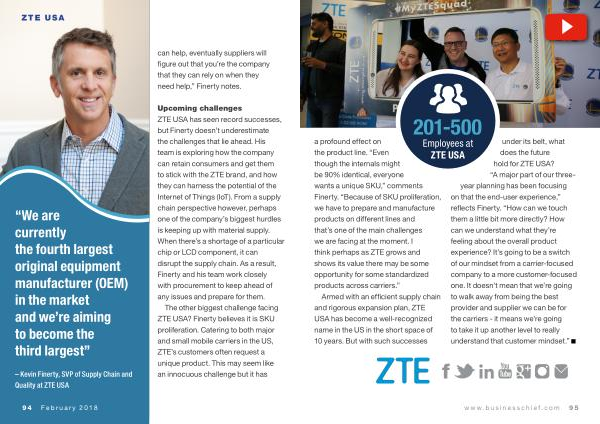 Upcoming challenges ZTE USA has seen record successes , but Finerty doesn ’ t underestimate the challenges that lie ahead . His team is exploring how the company can retain consumers and get them to stick with the ZTE brand , and how they can harness the potential of the Internet of Things ( IoT ). From a supply chain perspective however , perhaps one of the company ’ s biggest hurdles is keeping up with material supply . When there ’ s a shortage of a particular chip or LCD component , it can disrupt the supply chain . As a result , Finerty and his team work closely with procurement to keep ahead of any issues and prepare for them .