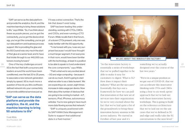 “ SAP can serve as the data platform and provide the analytics , the AI , and the machine learning to bring these solutions to life ,” says Wilde . “ So , if we think about these as puzzle pieces , you ’ ve got the connectivity , you ’ ve got the device strategy , you ’ ve got the consulting , you ’ ve got our data platform and business process support . We ’ re providing the glue and the 5G Council was very much the start of that glue at a senior level , and to have that trickle through to our 440,000 customers moving forward .”