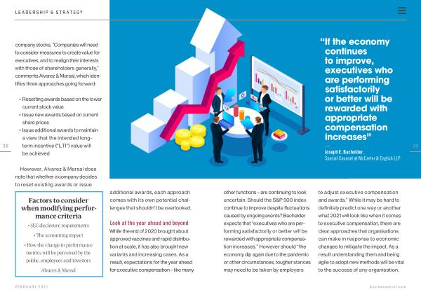 39 other functions – are continuing to look uncertain . Should the S & P 500 index continue to improve despite fluctuations caused by ongoing events ? Bachelder expects that “ executives who are performing satisfactorily or better will be rewarded with appropriate compensation increases .” However should “ the economy dip again due to the pandemic or other circumstances , tougher stances may need to be taken by employers to adjust executive compensation and awards .” While it may be hard to definitely predict one way or another what 2021 will look like when it comes to executive compensation , there are clear approaches that organisations can make in response to economic changes to mitigate the impact . As a result understanding them and being agile to adopt new methods will be vital to the success of any organisation .