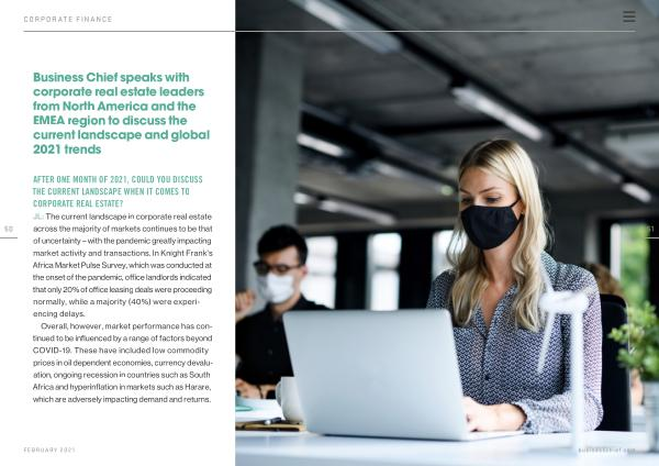 JL : The current landscape in corporate real estate across the majority of markets continues to be that of uncertainty – with the pandemic greatly impacting market activity and transactions . In Knight Frank ’ s Africa Market Pulse Survey , which was conducted at the onset of the pandemic , office landlords indicated that only 20 % of office leasing deals were proceeding normally , while a majority ( 40 %) were experiencing delays .