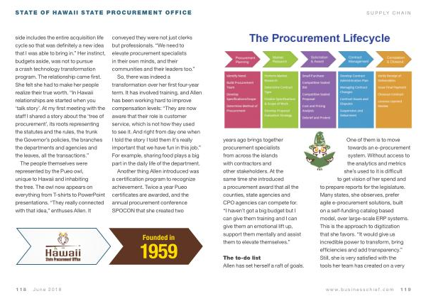 SUPPLY CHAIN years ago brings together procurement specialists from across the islands with contractors and other stakeholders . At the same time she introduced a procurement award that all the counties , state agencies and CPO agencies can compete for . “ I haven ’ t got a big budget but I can give them training and I can give them an emotional lift up , support them mentally and assist them to elevate themselves .”
