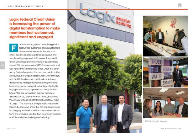 F or firms in the grips of nosediving profits , disgruntled customers and unsustainable business environments , the steps to effect positive change would be as obvious and simple as flipping a switch . However , for a credit union , which has grown its member base by 89 % since 2011 , has in excess of US $ 6bn in assets , and was named the number one credit union in California by Forbes Magazine , the next step might not be so obvious . For Logix Federal Credit Union though , an insightful and experienced leadership team , dedicated to intelligently implementing the latest technology while taking full advantage of a highly engaged workforce , is poised and ready for the future . “ We are fortunate in that our members already love us ,” says Edward Chuang , Executive Vice President and Chief Information Officer ( CIO ) at Logix . “ The important thing is not to rest on our laurels , because we know that the banking industry is changing , and we know that consumer expectations are changing , too . So , ‘ how do we stay number one ?’ is really the challenge we ’ re facing .”