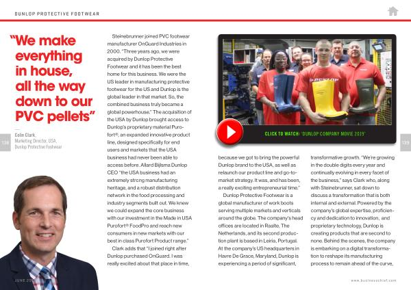 Dunlop Protective Footwear is a global manufacturer of work boots serving multiple markets and verticals around the globe . The company ’ s head offices are located in Raalte , The Netherlands , and its second production plant is based in Leiria , Portugal . At the company ’ s US headquarters in Havre De Grace , Maryland , Dunlop is experiencing a period of significant , transformative growth . “ We ’ re growing in the double digits every year and continually evolving in every facet of the business ,” says Clark who , along with Steinebrunner , sat down to discuss a transformation that is both internal and external . Powered by the company ’ s global expertise , proficiency and dedication to innovation , and proprietary technology , Dunlop is creating products that are second to none . Behind the scenes , the company is embarking on a digital transformation to reshape its manufacturing process to remain ahead of the curve ,