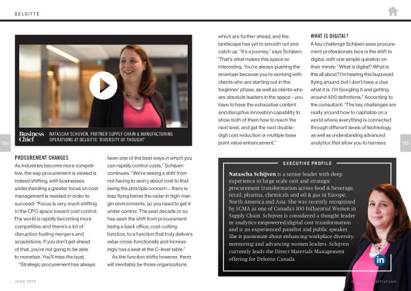 Natascha Schijven is a senior leader with deep experience in large scale cost and strategic procurement transformation across food & beverage , retail , pharma , chemicals and oil & gas in Europe , North America and Asia . She was recently recognized by SCMA as one of Canada ’ s 100 Influential Women in Supply Chain . Schijven is considered a thought leader in analytics-empowered / digital cost transformation and is an experienced panelist and public speaker . She is passionate about enhancing workplace diversity , mentoring and advancing women leaders . Schijven currently leads the Direct Materials Management offering for Deloitte Canada .