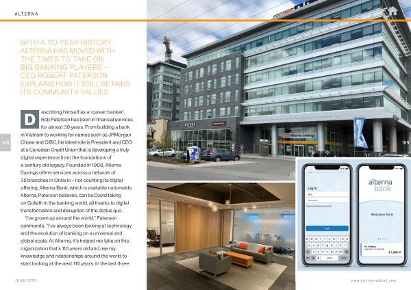 D escribing himself as a ‘ career banker ’, Rob Paterson has been in financial services for almost 30 years . From building a bank in Vietnam to working for names such as JPMorgan Chase and CIBC , his latest role is President and CEO at a Canadian Credit Union that is developing a truly digital experience from the foundations of a century old legacy . Founded in 1908 , Alterna Savings offers services across a network of 35 branches in Ontario – not counting its digital offering , Alterna Bank , which is available nationwide . Alterna , Paterson believes , can be David taking on Goliath in the banking world , all thanks to digital transformation and disruption of the status quo .