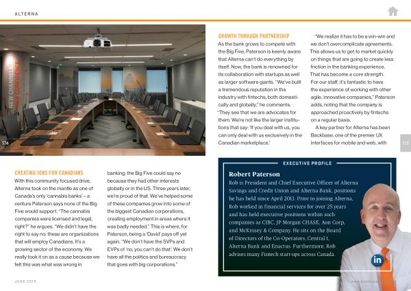As the bank grows to compete with the Big Five , Paterson is keenly aware that Alterna can ’ t do everything by itself . Now , the bank is renowned for its collaboration with startups as well as larger software giants . “ We ’ ve built a tremendous reputation in the industry with fintechs , both domestically and globally ,” he comments . “ They see that we are advocates for them . We ’ re not like the larger institutions that say : ‘ If you deal with us , you can only deal with us exclusively in the Canadian marketplace .’