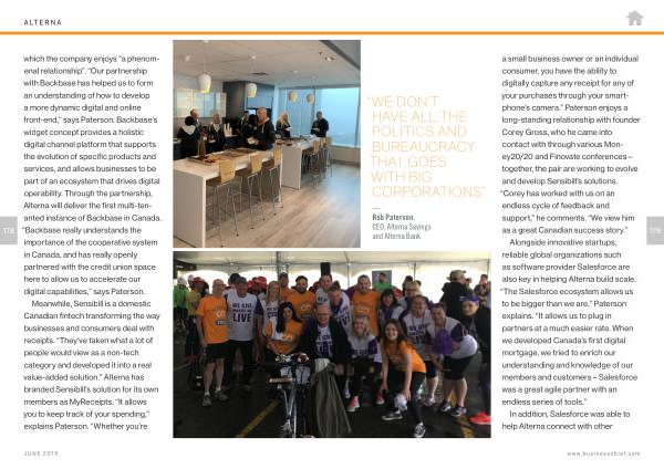 178 which the company enjoys “ a phenomenal relationship ”. “ Our partnership with Backbase has helped us to form an understanding of how to develop a more dynamic digital and online front-end ,” says Paterson . Backbase ’ s widget concept provides a holistic digital channel platform that supports the evolution of specific products and services , and allows businesses to be part of an ecosystem that drives digital operability . Through the partnership , Alterna will deliver the first multi-tenanted instance of Backbase in Canada . “ Backbase really understands the importance of the cooperative system in Canada , and has really openly partnered with the credit union space here to allow us to accelerate our digital capabilities ,” says Paterson .
