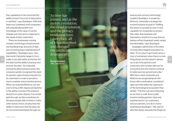 “ There are businesses running complex technology infrastructures and handling large amounts of data but not having super sophisticated IT capabilities ,” Guadagno says . “ Into that world , Carbonite began to form a plan to provide better protection for the data and the ability to backup and recover the data .” As Carbonite evolved its data backup process , the company quickly recognized the need for greater cyber threat protection for its customers in order to provide a more complete and protective service . “ When we acquired Webroot , our aim was to bring a 360-degree perspective to the ability to protect the endpoint device from cyber attacks . If an attack gets through , as they sometimes do because people clink on links or make other human errors , we also have the ability to make sure that the data can be recovered seamlessly through our