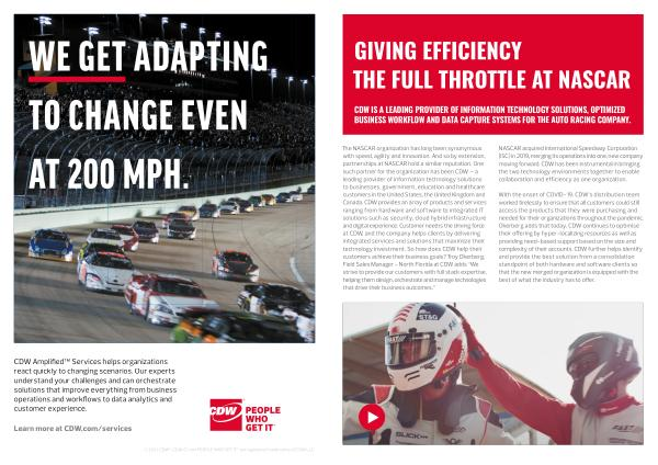 The NASCAR organization has long been synonymous with speed , agility and innovation . And so by extension , partnerships at NASCAR hold a similar reputation . One such partner for the organization has been CDW – a leading provider of information technology solutions to businesses , government , education and healthcare customers in the United States , the United Kingdom and Canada . CDW provides an array of products and services ranging from hardware and software to integrated IT solutions such as security , cloud hybrid infrastructure and digital experience . Customer need is the driving force at CDW , and the company helps clients by delivering integrated services and solutions that maximize their technology investment . So how does CDW help their customers achieve their business goals ? Troy Okerberg , Field Sales Manager - North Florida at CDW adds “ We strive to provide our customers with full stack expertise , helping them design , orchestrate and manage technologies that drive their business outcomes .”