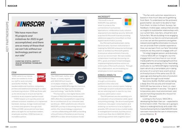 “ This has led to a new digital library with 73 years of NASCAR history media assets . AWS offers the cloud platform supporting the re-architecture of our consumer data warehouse . AWS ’ s platforms are critical to NASCAR ’ s journey to becoming more cloudcentric . Our cloud strategy is expansive – we are collaborating with AWS on building a Cloud Centre of Excellence and moving NASCAR to a data-driven business model .”