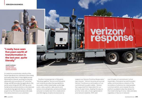 VERIZON BUSINESS support our Verizon Frontline Responders ,” says Hussain . “ Verizon recently announced Verizon Frontline as a continuation of our commitment to public safety - Verizon has supported first responders for our entire 21 year history , leading the way on priority voice calls , virtual segmentation and network reliability . With well over 10 years of commitment to first responders , Mutualink has led the public safety communications industry in the innovation of solutions for interoperable communications , and created the only platform available today that allows for the instant sharing of voice , video and data regardless of device or network .”