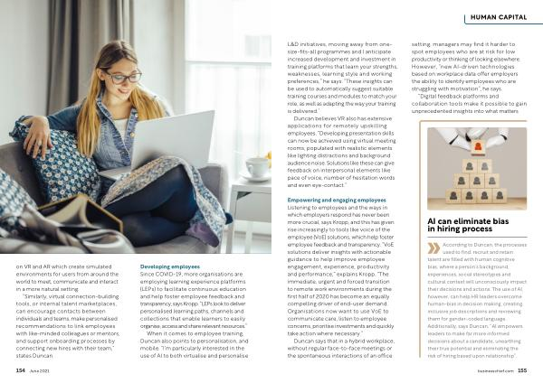 Duncan believes VR also has extensive applications for remotely upskilling employees . “ Developing presentation skills can now be achieved using virtual meeting rooms , populated with realistic elements like lighting distractions and background audience noise . Solutions like these can give feedback on interpersonal elements like pace of voice , number of hesitation words and even eye-contact .” setting , managers may find it harder to spot employees who are at risk for low productivity or thinking of looking elsewhere . However , “ new AI-driven technologies based on workplace data offer employers the ability to identify employees who are struggling with motivation ”, he says .