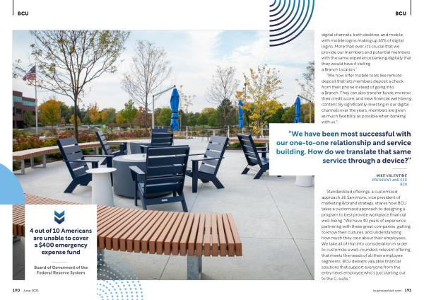 Standardized offerings , a customized approach Jill Sammons , vice president of marketing & brand strategy , shares how BCU takes a customized approach to designing a program to best provide workplace financial well-being . " We have 40 years of experience partnering with these great companies , getting to know their cultures , and understanding how much they care about their employees . We take all of that into consideration in order to customize a well-rounded , relevant offering that meets the needs of all their employee segments . BCU delivers valuable financial solutions that support everyone from the entry-level employee who ’ s just starting out to the C-suite ." businesschief . com 191