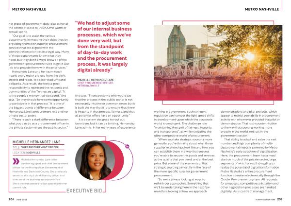That ability to adapt and solve the vast number and high complexity of multidepartmental needs is powered by Metro Nashville ’ s early adoption of digitalization . Here , the procurement team has a head start on much of the private sector , large segments of which are still struggling to realize the potential of digital transformation . Metro Nashville ’ s entire procurement function operates electronically through the Oracle iProcurement system . All requests for proposals , competitive solicitation and other negotiation processes are handled digitally . As is contract management ,