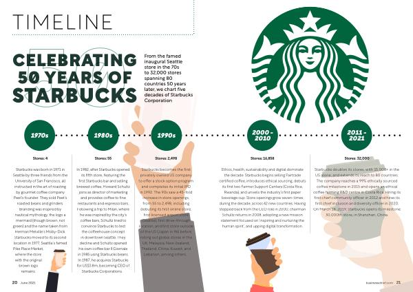 Starbucks doubles its stores , with 15,000 + in the US alone , and extends its reach to 80 countries . The company reaches a 99 % ethically sourced coffee milestone in 2015 and opens an ethical coffee farming R & D centre in Costa Rica . Hiring its first chief community officer in 2012 and hires its first chief inclusion and diversity officer in 2020 . On March 18 , 2019 , Starbucks opens its milestone 30,000th store , in Shenzhen , China .