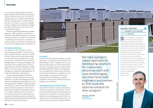 “ We recently expanded our portfolio to address a variety of factors owners and engineers consider when designing a data center , including water availability , first cost , energy efficiency , reliability , scalability , speed , and simplicity . Because we take a projectbased , solutions approach , Munters isn ’ t pushing pre-designed , standard products to our data center customers . We have the technical expertise to partner with our customers to develop a solution that fits their specific needs , and the proven manufacturing flexibility to meet their demand .”