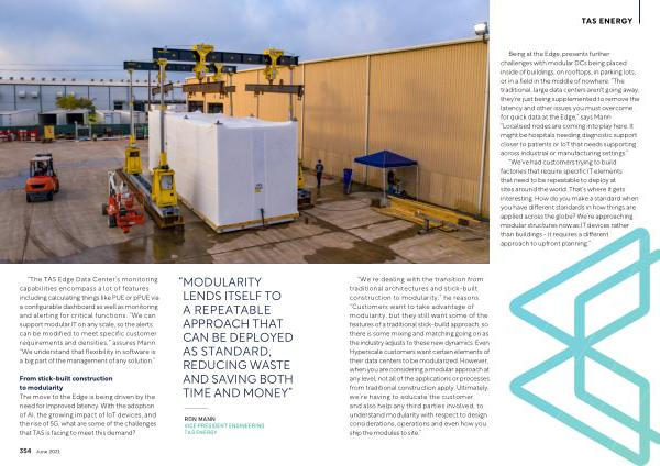 Being at the Edge , presents further challenges with modular DCs being placed inside of buildings , on rooftops , in parking lots , or in a field in the middle of nowhere . “ The traditional , large data centers aren ' t going away , they ' re just being supplemented to remove the latency and other issues you must overcome for quick data at the Edge ,” says Mann . “ Localised nodes are coming into play here . It might be hospitals needing diagnostic support closer to patients or IoT that needs supporting across industrial or manufacturing settings .” “ We ' ve had customers trying to build factories that require specific IT elements that need to be repeatable to deploy at sites around the world . That ' s where it gets interesting . How do you make a standard when you have different standards in how things are applied across the globe ? We ’ re approaching modular structures now as IT devices rather than buildings - it requires a different approach to upfront planning .”