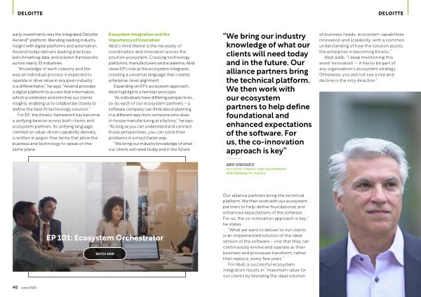 Ecosystem Integration and the Importance of Innovation Abdi ’ s third theme is the necessity of coordination and innovation across the solution ecosystem . Crossing technology platforms , manufacturers and academia , Abdi views EP ’ s role as the ecosystem integrator , creating a universal language that creates enterprise-level alignment .
