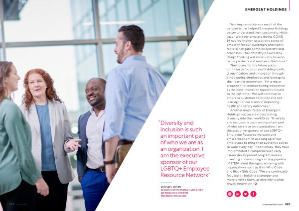 Another major factor of Emergent Holdings ’ success is incorporating diversity into their workforce . " Diversity and inclusion is such an important part of who we are as an organization . I am the executive sponsor of our LGBTQ + Employee Resource Network and am a proponent of allowing all of our employees to bring their authentic selves to work every day .” Additionally , they have implemented a comprehensive early career development program and are investing in developing a strong pipeline of STEM talent through partnering with organizations such as Girls Who Code and Black Girls Code . “ We are continually focused on building a stronger and more diverse team , as diversity is what drives innovation ." businesschief . com 425