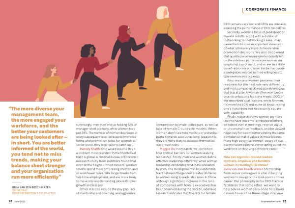 JULIA VAN DEN BOSCH WAZEN CONSULTANT , ODGERS BERNDTSON ’ S CFO PRACTICE surprisingly , men then end up holding 62 % of manager-level positions , while women hold just 38 %. The number of women decreases at every subsequent level , so despite improved hiring and promotion rates for women at senior levels , they aren ’ t able to catch up .
