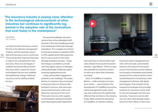 Early in CodeBlue ’ s inception , Manns — while working at an insurance carrier — was involved in the development of CodeBlue ’ s proactive claims management model , which was and continues to be significantly different than all others in the industry . Today , Manns leads the operations at CodeBlue , an industry-leading insurance claims management provider with full scale customisable solutions . Drawing from his experiences in the insurance carrier industry , he focused on immediate policyholder actions at first contact and the continued development of proprietary claim management software with digital technologies . This included virtual inspections strategies that provided solutions for insurance carrier staff to view loss damages real-time and remotely . “ Insurance carrier staff can now view initial damage inspections from their office in a few hours
