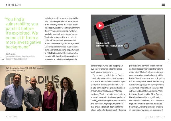By partnering with fintechs , Radius drastically reduces its time to market and was able to rebuild its entire digital platform in a mere four months . “ Our digital banking strategy is built around fintech driven technology ,” Mancini explains . “ Push products , gain customers and create a frictionless experience . The biggest challenge is speed to market and flexibility . Aligning with partners that provide the high-tech platforms allows us to offer these industry-leading products and services to consumers and businesses .” Some partners play a major role in Radius ’ risk prevention programmes ; Alloy operates heavily within Radius ’ fraud prevention space . Together , the two companies rebuilt the model by which Radius judges the risk of potential customers , integrating a risk waterfall with seven to eight checkpoints . With the help of partners like Alloy , Radius Bank has been able to significantly decrease its fraudulent account openings . The financial benefits have also been high , while the technology costs of opening a new account decreased .