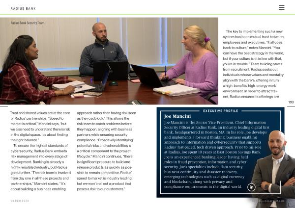 To ensure the highest standards of cybersecurity , Radius Bank embeds risk management into every stage of development . Banking is already a highly regulated industry , but Radius goes further . “ The risk team is involved from day one in all these projects and partnerships ,” Mancini states . “ It ’ s about building a business enabling approach rather than having risk seen as the roadblock .” This allows the risk team to catch problems before they happen , aligning with business partners while ensuring security compliance . “ Proactively identifying potential risks and vulnerabilities is a critical component to the project lifecycle .” Mancini continues , “ there is significant pressure to build and release products as quickly as possible to remain competitive . Radius ’ speed to market is industry leading , but we won ’ t roll out a product that poses a risk to our customers .”