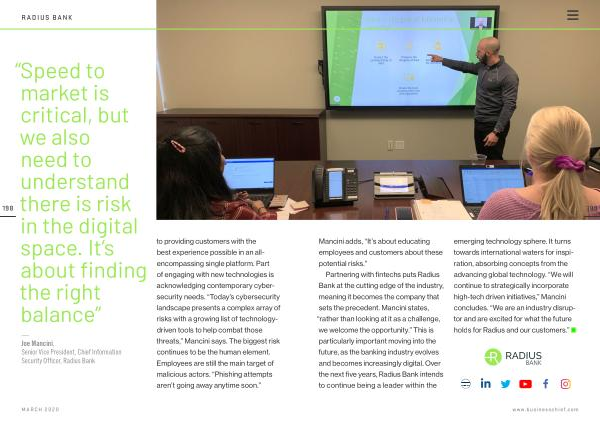 Partnering with fintechs puts Radius Bank at the cutting edge of the industry , meaning it becomes the company that sets the precedent . Mancini states , “ rather than looking at it as a challenge , we welcome the opportunity .” This is particularly important moving into the future , as the banking industry evolves and becomes increasingly digital . Over the next five years , Radius Bank intends to continue being a leader within the emerging technology sphere . It turns towards international waters for inspiration , absorbing concepts from the advancing global technology . “ We will continue to strategically incorporate high-tech driven initiatives ,” Mancini concludes . “ We are an industry disruptor and are excited for what the future holds for Radius and our customers .”