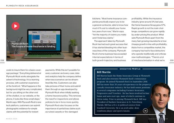 208 costs to insure them for a basic coverage package .” Everything delivered at Plymouth Rock works alongside the advent of technology . It is a learning process , with customer experience at the forefront . “ What happens in the background might be very complicated , but for you sitting on the other end of the chatbot , or our website , or the phone , it looks like three small steps ,” Martin says . With Plymouth Rock ’ s new tech platform , customers can submit photographic evidence for simple claims with the potential for instant payments . While this isn ’ t possible for every customer and every case , data and analytics help the company define when loss scenarios can be streamlined like this . Customers can also take pictures of their home and submit them through an app developed by Plymouth Rock when initially seeking a home insurance policy . This removes the need for inspections and allows policies to be in force more quickly . Plymouth Rock also focuses on the importance of partial loss claims such as ruined carpets or fire-damaged