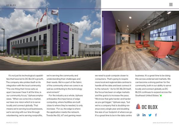 It ’ s not just its technological capabilities that have led to DC BLOX ’ s growth . The company also prides itself on its integration with the local community . “ The one thing that I know sets us apart , because I hear it all the time , is our community focus ,” Uphues emphasises . “ When we come into a market , we have one vision which is to serve locally and connect globally . That means we ’ re serving local businesses , we ’ re serving with our time through volunteering , we ’ re serving nonprofits ,