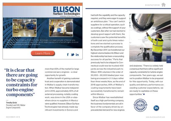 MANUFACTURING had both the capability and the capacity required , and they were eager to support an ambitious plan . “ You can ’ t switch suppliers for a critical operation , such as coatings , without the support of your customers . But after we had started to develop good rapport with them , the customers saw the potential benefits of both cost and cycle times reductions and we started a process to complete the qualification process . By December 2017 , we transitioned our highest volume blades into Ellison and the relationship has been a resounding success for all parties .” Parts that previously had to be shipped to Connecticut could now be trucked 400 yards across the industrial park to Ellison . With volumes in the order of 50,000 – 90,000 blades / year now being processed in 2-3 days rather than three weeks . Now , as the end of 2018 approaches , 85 % of Walbar ’ s coating requirements have been successfully transitioned to remain within Mexico .