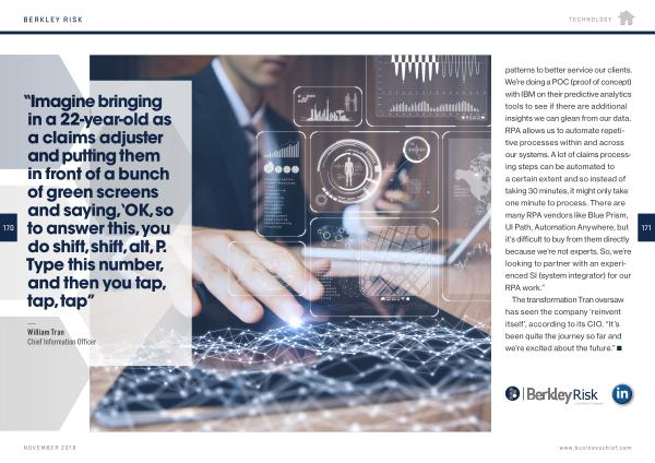 patterns to better service our clients . We ’ re doing a POC ( proof of concept ) with IBM on their predictive analytics tools to see if there are additional insights we can glean from our data . RPA allows us to automate repetitive processes within and across our systems . A lot of claims processing steps can be automated to a certain extent and so instead of taking 30 minutes , it might only take one minute to process . There are many RPA vendors like Blue Prism , UI Path , Automation Anywhere , but it ’ s difficult to buy from them directly because we ’ re not experts . So , we ’ re looking to partner with an experienced SI ( system integrator ) for our RPA work .”