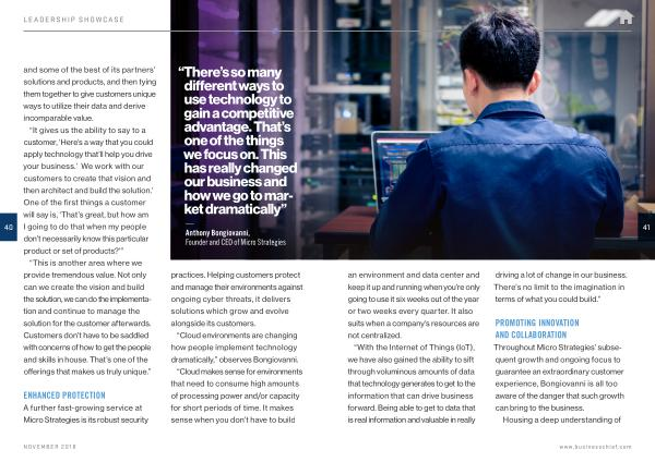 Throughout Micro Strategies ’ subsequent growth and ongoing focus to guarantee an extraordinary customer experience , Bongiovanni is all too aware of the danger that such growth can bring to the business .