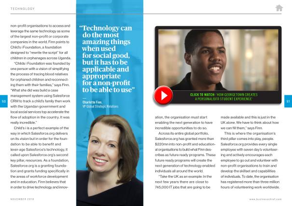 Child ’ s i is a perfect example of the way in which Salesforce . org delivers on its vision but in order for the foundation to be able to benefit and lever-age Salesforce ’ s technology , it called upon Salesforce . org ’ s second key pillar , resources . As a foundation , Salesforce . org is a granting foundation and grants funding specifically in the areas of workforce development and in education . Finn believes that in order to drive technology and innov-