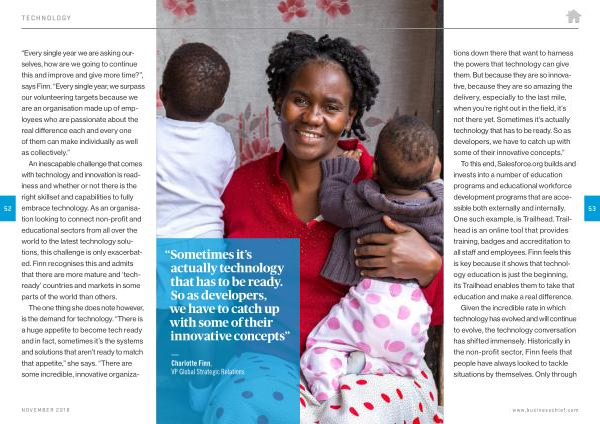 To this end , Salesforce . org builds and invests into a number of education programs and educational workforce development programs that are accessible both externally and internally . One such example , is Trailhead . Trailhead is an online tool that provides training , badges and accreditation to all staff and employees . Finn feels this is key because it shows that technology education is just the beginning , its Trailhead enables them to take that education and make a real difference . Given the incredible rate in which technology has evolved and will continue to evolve , the technology conversation has shifted immensely . Historically in the non-profit sector , Finn feels that people have always looked to tackle situations by themselves . Only through