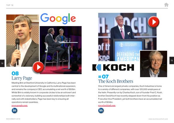 One of America ’ s largest private companies , Koch Industries is home to a variety of different companies , with over 120,000 employees at the helm . Presently run by Charles Koch , son of founder Fred C . Kosh , brother David Koch has recently stepped down from his position as Executive Vice President , yet both brothers have an accumulated net worth of $ 54bn . www . kochind . com