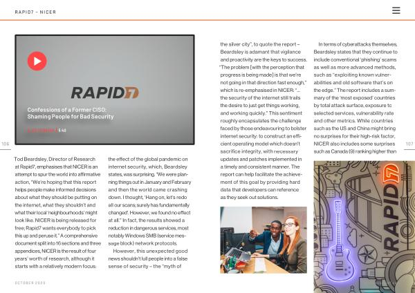 Tod Beardsley , Director of Research at Rapid7 , emphasises that NICER is an attempt to spur the world into affirmative action , “ We ’ re hoping that this report helps people make informed decisions about what they should be putting on the internet , what they shouldn ’ t and what their local ‘ neighbourhoods ’ might look like . NICER is being released for free ; Rapid7 wants everybody to pick this up and peruse it .” A comprehensive document split into 16 sections and three appendices , NICER is the result of four years ’ worth of research , although it starts with a relatively modern focus : the effect of the global pandemic on internet security , which , Beardsley states , was surprising . “ We were planning things out in January and February and then the world came crashing down . I thought , ‘ Hang on , let ’ s redo all our scans ; surely has fundamentally changed ’. However , we found no effect at all .” In fact , the results showed a reduction in dangerous services , most notably Windows SMB ( service message block ) network protocols .