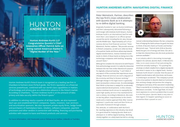 Originally founded in 1901 as Hunton & Williams and then subsequently rebranded following a 2018 merger with Andrews Kurth Kenyon , Hunton Andrews Kurth is an international law firm with more than 1,000 lawyers in 20 offices spread around the world , including the US , Asia , Europe and the Middle East . “ Approximately 30 % of our revenue derives from financial services ,” Peter Weinstock , Partner , explains . “ We provide services to fintech companies , as well as to what we think of as partner banks and those advancing towards digital transformation . Hunton Andrews Kurth tends to think of these banks as being more like technology companies with banking ‘ wrapping around ’ them .” Although he considers his interest to lie with finance first and technology second , it is really the interaction between the two that stokes Weinstock ’ s passion for digitally-enhanced banking , “ I can ’ t think of any aspect of the economy that experiences more change ; financial services are such a big part of the economy and they ’ re forever evolving .” Although change in the legal sector is generally ( and necessarily ) a slow process , he acknowledges that COVID-19 has been a catalyst for accelerated , unprecedented developments . In this climate , Hunton Andrews Kurth strives to exemplify the same high-quality service it has maintained for over a century . According to Weinstock , this rests on two key pillars : responsiveness to the client ’ s needs and a creative approach that often ‘ reverse engineers ’ a particular need and then forms an actionable framework through analysis . This attitude , in combination with the firm ’ s far-reaching experience in the industry , has stood it in good stead for helping Quontic Bank as it attempts to re-define digital banking . Working closely together on a daily basis has led to a strong