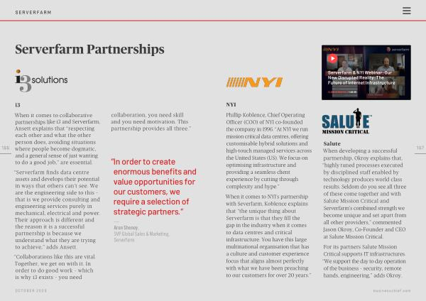When it comes to NYI ’ s partnership with Severfarm , Koblence explains that “ the unique thing about Serverfarm is that they fill the gap in the industry when it comes to data centres and critical infrastructure . You have this large multinational organisation that has a culture and customer experience focus that aligns almost perfectly with what we have been preaching to our customers for over 20 years .”