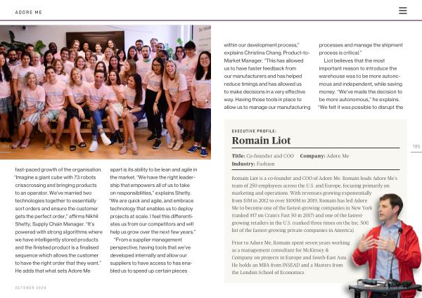 Romain Liot is a co-founder and COO of Adore Me . Romain leads Adore Me ’ s team of 250 employees across the U . S . and Europe , focusing primarily on marketing and operations . With revenues growing exponentially from $ 1M in 2012 to over $ 100M in 2019 , Romain has led Adore Me to become one of the fastest-growing companies in New York ( ranked # 17 on Crain ’ s Fast 50 in 2017 ) and one of the fastestgrowing retailers in the U . S . ( ranked three times on the Inc . 500 list of the fastest-growing private companies in America ).