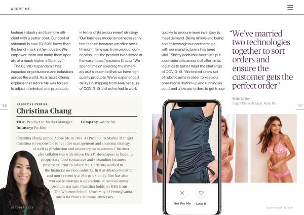 The COVID-19 pandemic has impacted organisations and industries across the world . As a result , Chang explains that Adore Me was forced to adjust its mindset and processes in terms of its procurement strategy . “ Our business model is not necessarily fast fashion because we often see a 14-month time gap from product conception until the product is delivered at the warehouse ,” explains Chang . “ We spend time on sourcing the materials as it ’ s essential that we have high quality products . We ’ ve experienced delays in shipping from Asia because of COVID-19 and we ’ ve had to work