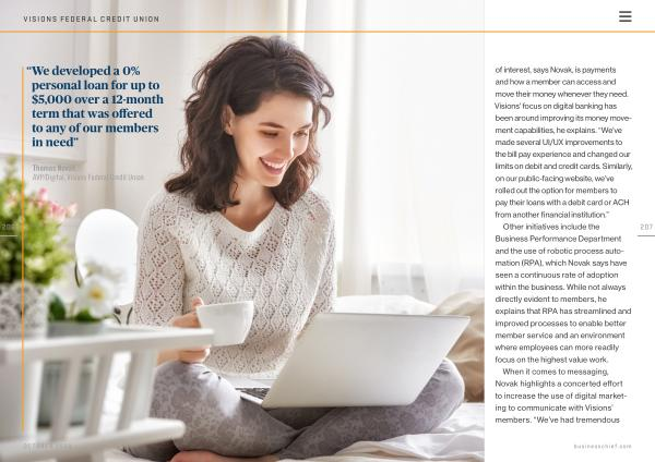 of interest , says Novak , is payments and how a member can access and move their money whenever they need . Visions ’ focus on digital banking has been around improving its money movement capabilities , he explains . “ We ’ ve made several UI / UX improvements to the bill pay experience and changed our limits on debit and credit cards . Similarly , on our public-facing website , we ’ ve rolled out the option for members to pay their loans with a debit card or ACH from another financial institution .”