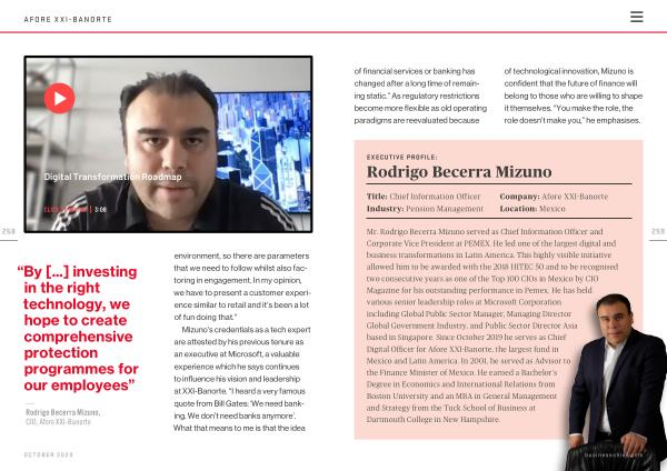 Mr . Rodrigo Becerra Mizuno served as Chief Information Officer and Corporate Vice President at PEMEX . He led one of the largest digital and business transformations in Latin America . This highly visible initiative allowed him to be awarded with the 2018 HITEC 50 and to be recognised two consecutive years as one of the Top 100 CIOs in Mexico by CIO Magazine for his outstanding performance in Pemex . He has held various senior leadership roles at Microsoft Corporation including Global Public Sector Manager , Managing Director Global Government Industry , and Public Sector Director Asia based in Singapore . Since October 2019 he serves as Chief Digital Officer for Afore XXI-Banorte , the largest fund in Mexico and Latin America . In 2001 , he served as Advisor to the Finance Minister of Mexico . He earned a Bachelor ’ s Degree in Economics and International Relations from Boston University and an MBA in General Management and Strategy from the Tuck School of Business at Dartmouth College in New Hampshire .