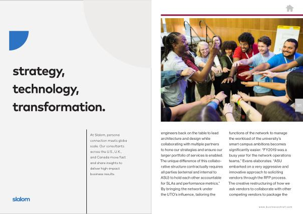 121 engineers back on the table to lead architecture and design while collaborating with multiple partners to hone our strategies and ensure our larger portfolio of services is enabled . The unique difference of this collaborative structure contractually requires all parties ( external and internal to ASU ) to hold each other accountable for SLAs and performance metrics .” By bringing the network under the UTO ’ s influence , tailoring the functions of the network to manage the workload of the university ’ s smart campus ambitions becomes significantly easier . “ FY2019 was a busy year for the network operations teams ,” Evans elaborates . “ ASU embarked on a very aggressive and innovative approach to soliciting vendors through the RFP process . The creative restructuring of how we ask vendors to collaborate with other competing vendors to package the