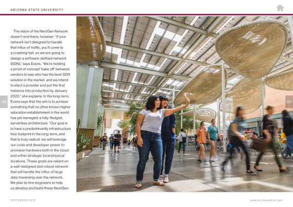The vision of the NextGen Network doesn ’ t end there , however . “ If your network isn ’ t designed to handle that influx of traffic , you ’ ll come to a crashing halt , so we are going to design a software-defined network ( SDN ),” says Evans . “ We ’ re holding a proof of concept ‘ bake off ’ between vendors to see who has the best SDN solution in the market , and we intend to elect a provider and put the first instance into production by January 2020 ,” she explains . In the long-term , Evans says that the aim is to achieve something that no other known higher education establishment in the world has yet managed : a fully-fledged , serverless architecture . “ Our goal is to have a predominantly infrastructure free footprint in the long-term , and that is truly radical : we will leverage our code and developer power to provision hardware both in the cloud and within strategic local physical locations . These goals are reliant on a well-designed and robust network that will handle the influx of large data traversing over the network . We plan to hire engineers to help us develop and build these NextGen